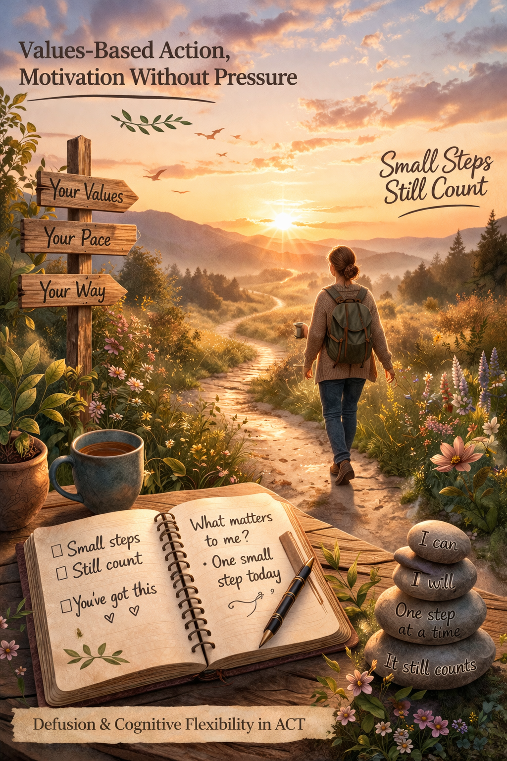 In Acceptance and Commitment Therapy (ACT), change is not about forcing yourself, pushing through harshly or waiting until you feel fully motivated. It is about moving gently, imperfectly and intentionally in the direction of the life you want to live.